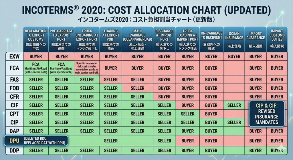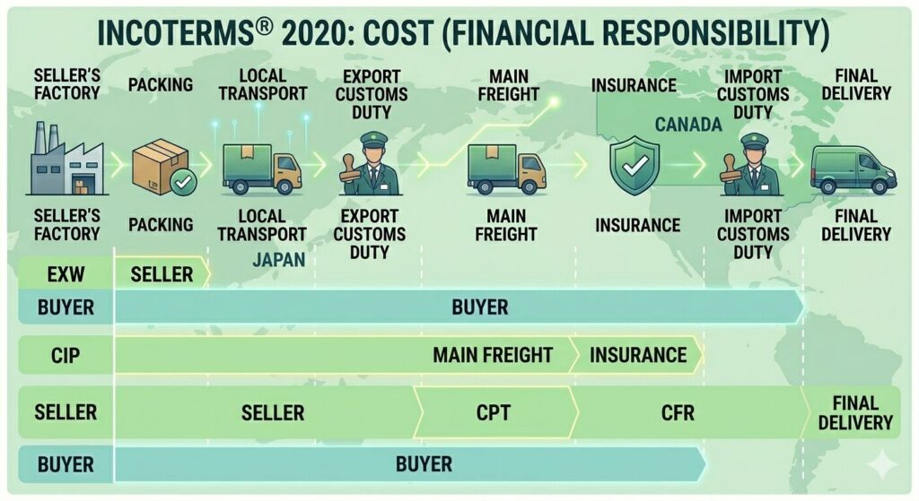 つまり、逆を言うと買い手(カナダ側)は日本の工場の入り口の前に運送業者を送って集積を掛けて日本の空港か港に送って、輸出手続きを済ませて海上運賃または航空運賃を払う義務を負えてカナダ側で通関業務を行う必要があります。