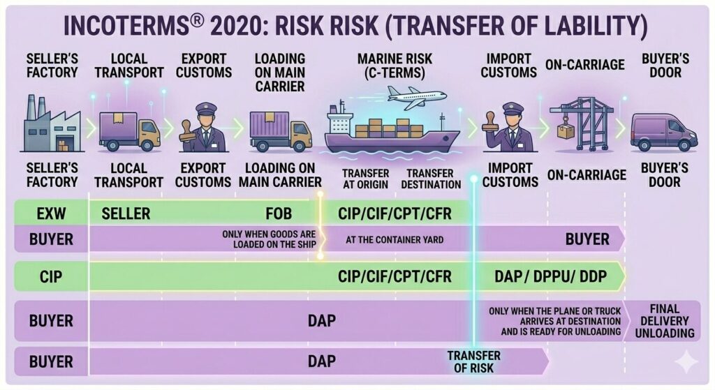 最後はリスクになりますが、こちらも他のファクターであるタスクやコストと同じくらい重要になります。基本的なコンセプトは”もし予想できない事が起こり損失が発生したときには誰が責任をとるのか?” 昨今では中東の戦争が一例になりますね。2026年4月時点では多数の航空会社が中東の上空の飛行を停止していて、他のルートを通過して他国に行く必要があります。つまり追加のサーチャージ費用などが発生してることになります。
