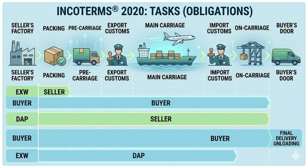 タスクを日本語に直訳すると仕事や義務という感じになります。このTASKの基本的な意味は売り手と買い手が国際貿易の何処まで義務を負うかということで間違いありません。例えば、売り手(日本からカナダへの輸出)の負担が最も少ないEXWでは、売り手の義務が商品を作る工場の入り口の前で買い手に移行します。(売り手は商品を工場の入り口の前で買い手に引き取ってもらうだけ)