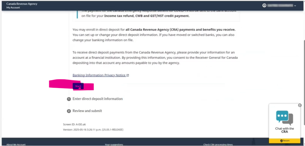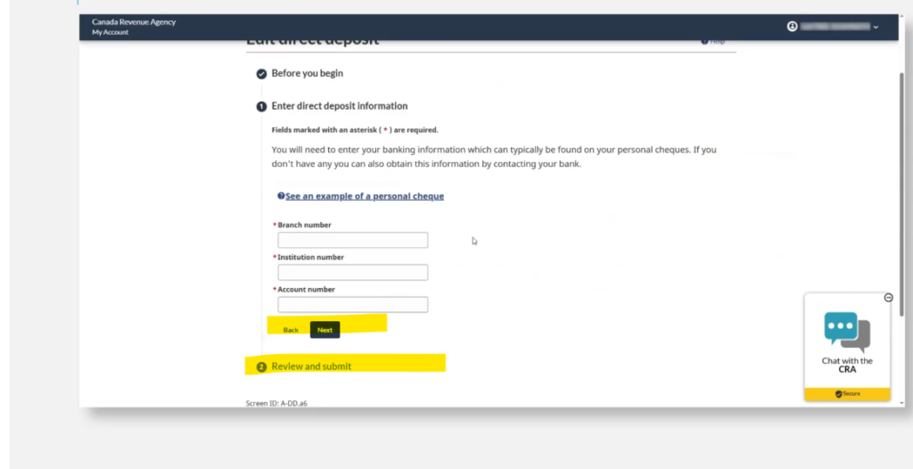 この一連のプロセスでSECURITY CODEを発行して弊社の住所に送ることができます。5days-10day後に弊社でSECUIRTYCODEを受け取った後に、ご連絡を差し上げますのでそのSECURITYCODEを使って”再度、MYCRAにログインをしてDIRECTDEPOSITの登録/アップデートをしてください”そのため、まずはSECURITYCODEをお待ちください